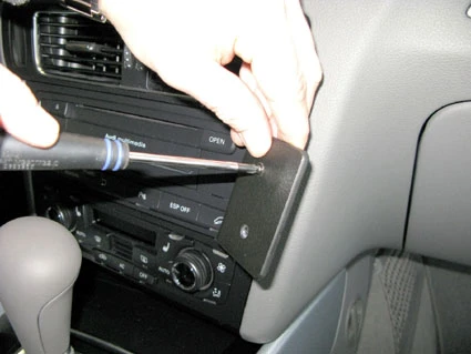 Press a screwdriver (Philips) firmly through the predrilled holes in Part 2 to open them up. Peel off the cover of the adhesive tape on Part 2. Place Part 2 onto Part 1 so the holes match and the adhesive tape on Part 2 is on the left side. Do not press the tape to the center console panel frame yet. Screw Part 2 onto Part 1 using the enclosed screws. Right before you tighten the screws press the ProClip to the right with your thumb for optimal adjustment of the mount. Then press the adhesive tape on the left side of Part 2 to the center panel. Hold the ProClip in that position and tighten the screws.