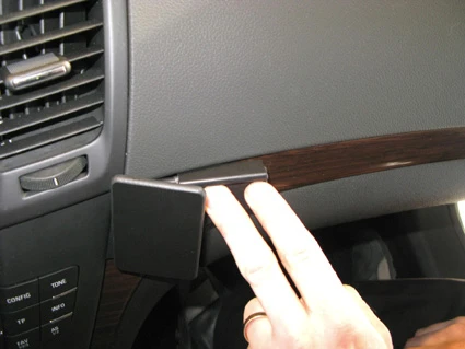 Press forward on the right side of the ProClip so the grooved edge goes into the gap between the dashboard and the trim. Press until you hear/feel it snaps into place.