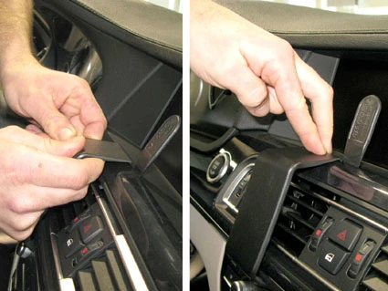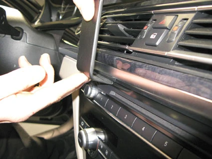 Use the enclosed alcohol pad to clean the area where the ProClip is to be installed. Press the thin end of the enclosed gap opener into the gap between the trim and the panel surrounding the display, to widen the gap. Peel off the adhesive tape cover on the ProClip. Press the angled edge on the lower part of the ProClip into the gap between the control panel and the surrounding frame.