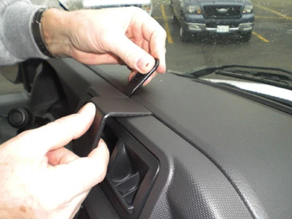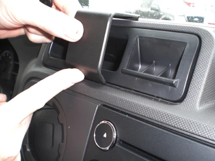 Use the enclosed alcohol pad to clean the area where the ProClip is to be installed. Peel off the cover of adhesive tape on the ProClip. Press the curved edge on the lower part of the ProClip into the gap between the dashboard and the coin box. Press until you see or hear it clicks into place.