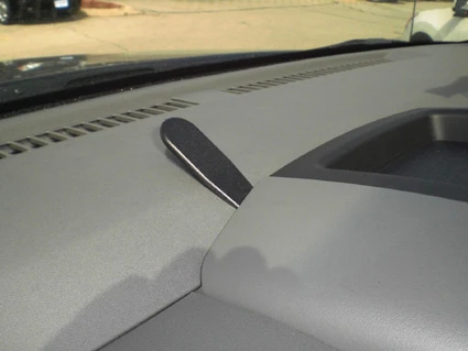 Use the enclosed alcohol pad to clean the area where the ProClip is to be installed. Press the thin end of the enclosed gap opener into the gap between the dashboard and the center console top, to widen the gap. Peel off the cover of adhesive tape on the ProClip.