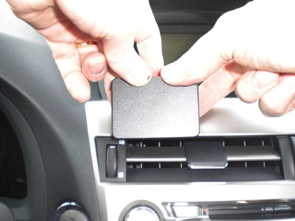 Use the enclsoed alcohol pad to clean the area where the ProClip is to be installed. Press the thin end of the enclosed gap opener into the gap between the dashboard ledge and the center console top, to widen the gap. Peel off the cover of adhesive tape on the ProClip. Hook the curved edge on the upper part of the ProClip into the gap next to the gap opener. Press until you see or hear/feel it click into place. Pull out the gap opener.