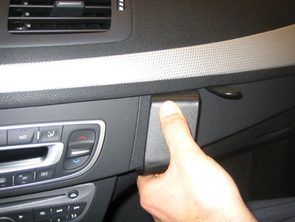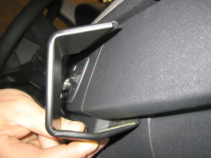 Use the enclosed alcohol pad to clean the area where the ProClip is to be installed. Press the thin end of the enclosed gap opener into the gap between the upper and lower section of the dashboard. Peel off the adhesive tape cover on the ProClip. Press the angled edge on the lower part of the ProClip into the gap between the panel and the dashboard overhang.