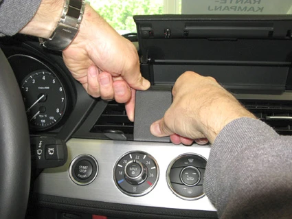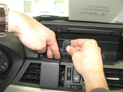 Press the gap opener into the gap between the the frame surrounding the control panel and the frame surrounding the air vent. Press the ProClip downward and hook the angled lower edge into the gap next to the gap opener. Press forward on the lower part of the ProClip so the angled edge goes all the way into the gap.
