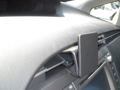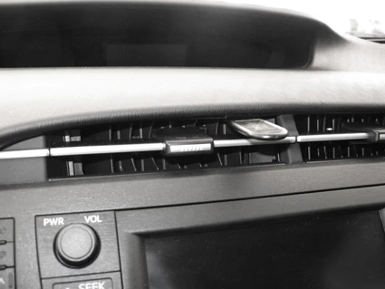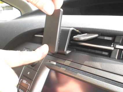 Hold the ProClip into the upper gap. Then with your other hand slowly push the lower part of the ProClip forward until the angled lower edge clicks into the seam/gap between the air vent and the surrounding frame. Pull out the gap opener.
