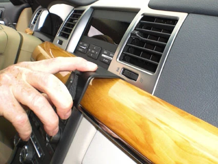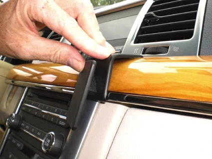 Use the enclosed alcohol pad to clean the area where the ProClip is to be installed. Peel off the cover of adhesive tape on the ProClip. Press/hook the angled edge on the upper part of the ProClip into the gap between the air vent panel frame and the wood grain trim.