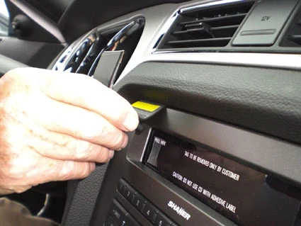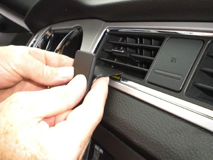 Place your index fingers underneath the top part of the ProClip. Then push upwards and hook the angled edge around the air vent edge.