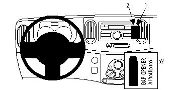 Use the enclosed alcohol pad to clean the area where the ProClip is to be installed. Press the thin end of the enclosed gap openers into the gap between the stereo and the surrounding panel frame, to widen it. Peel off the cover of adhesive tape on the ProClip. Press the angled edge on the right side of the ProClip into the seam between the air vent wall and the surrounding panel frame.