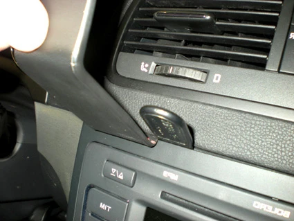 Press the angled edge on the lower part of the ProClip into the gap next to the gap opener. Flip the ProClip upward/forward so the angled lower edge hooks behind the center console. Pull out the gap opener.