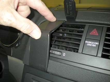 Press the gap opener into the gap between the frame surrounding the air vent and the dashboard. Hook the angled edge on the upper part of the ProClip into the gap next to the gap opener. Press down on top of the ProClip so the angled edge goes all the way into the gap. Pull out the gap opener.