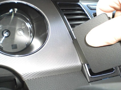 Use the enclosed alcohol pad to clean the area where the ProClip is to be installed. Peel off the cover of adhesive tape on the ProClip. Hold the ProClip in an almost 45 degree angle towards the dashboard and press the curved edge on the left side of the ProClip into the gap between the instrument panel and the air vent panel.