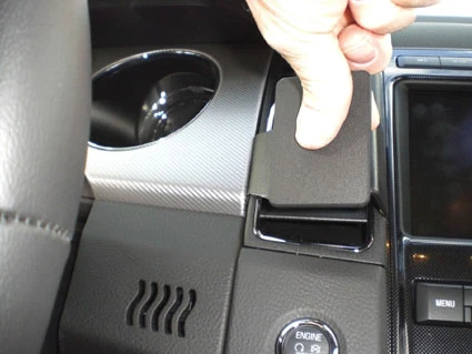 Place your thumb on the right side of the ProClip and press firmly forward so the angled edge hooks into the seam/gap between the air vent panel and the center console panel. Press until you see or hear/feel it click into place.