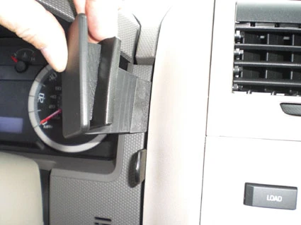 Flip the right side of the ProClip towards the air vent, so the curved edge on the left side hooks behind the instrument panel frame. Press the gap opener into the gap between the console edge and the center console panel frame. Place your index fingers behind the ProClip and push so the angled edge hooks into the gap above to the gap opener. Push firmly forward on the right side of the ProClip to make sure the angled edge is all the way into the gap and for best possible attachment of the adhesive tape. Pull out the gap opener.