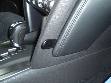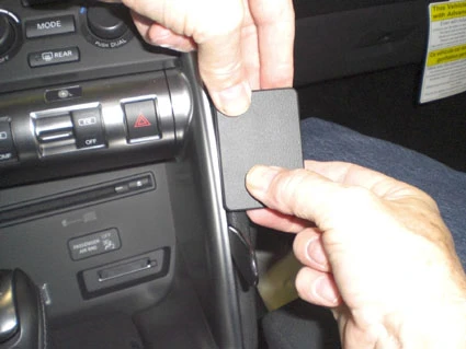 Use the enclosed alcohol pad to clean the area where the ProClip is to be installed. Press the thin end of the enclosed gap opener into the gap between the center console edge and the padded part of the sidewall, to widen the gap. Peel off the cover of adhesive tape on the ProClip.