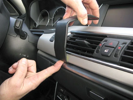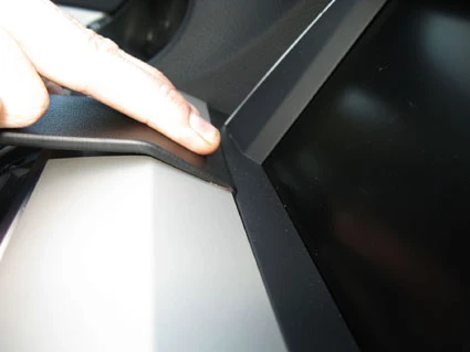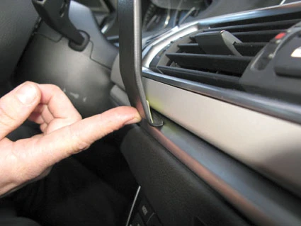 Hook the angled edge on the upper part of the ProClip into the gap between the panel surrounding the information window and the dashboard. Press down on top of the ProClip so the angled edge goes all the way into the gap.