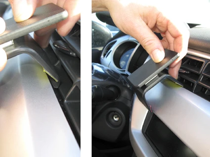 Use the enclosed alcohol pad to clean the area where the ProClip is to be installed. Peel off the adhesive tape covers on the ProClip. Hook the angled edge on the upper part of the ProClip behind the panel surorunding the air vent.