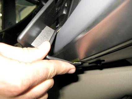 Use the enclosed alcohol pad to clean the area where the ProClip is to be installed. Peel off the adhesive tape covers on the ProClip. Press the curved edge on the upper part of the ProClip into the gap between the trim and the control panel. Flip the ProClip downward/forward so the curved upper edge hooks behind the control panel.
