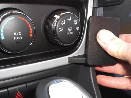 Press the thin end of the enclosed gap opener into the gap between the center console panel and the console edge, to widen the gap. Use the enclosed alcohol pad to clean the area where the ProClip is to be installed. Peel off the cover of adhesive tape on the ProClip.