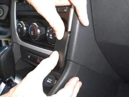 Press the vertical grooved edge on the ProClip into the gap next to the gap opener, and align it so the left horizontal support attaches to the trim.