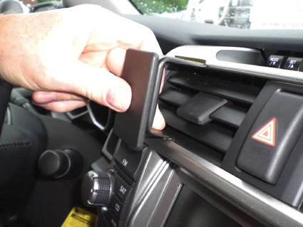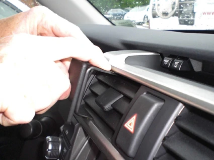 Use the enclosed alcohol pad to clean the area where the ProClip is to be installed. Peel off the cover of adhesive tape on the ProClip. Press the thin angled edge on the lower part of the ProClip into the seam/gap between the air vent and the surrounding panel frame.