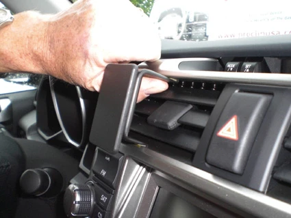 Press firmly down on top of the ProClip so it flexes downward. Then hook it into the seam/gap between the air vent and the surrounding panel frame. Release the pressure on top of the ProClip.