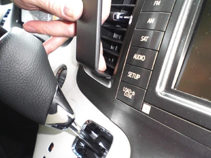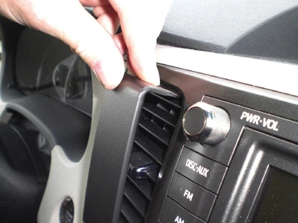 Use the enclosed alcohol pad to clean the area where the ProClip is to be installed. Peel off the cover of adhesive tape on the ProClip. Press the thin angled edge on the lower part of the ProClip into the seam/gap between the air vent and the surrounding panel frame.
