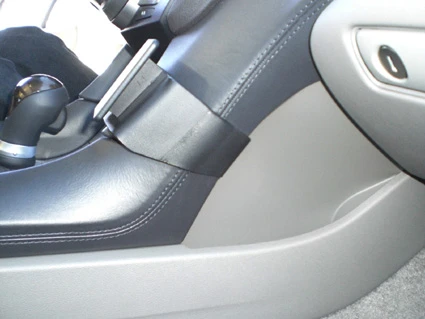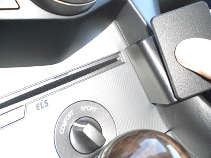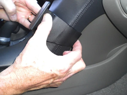 Place your hand over the right side of the ProClip and press forward with your thumb. At the same time pull the angled edge away from the console sidewall to clear off the padding. Then hook the angled edge into the gap in the sidewall.