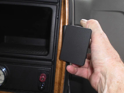 Use the enclosed alcohol pad to clean the area where the ProClip is to be installed. Peel off the cover of adhesive tape on the ProClip. Hook the angled edge on the left side of the ProClip over the center console edge.