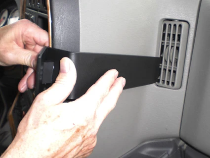 Press firmly forward on the right side of the ProClip so it flexes towards the air vent, and the angled edge hooks around the air vent edge.