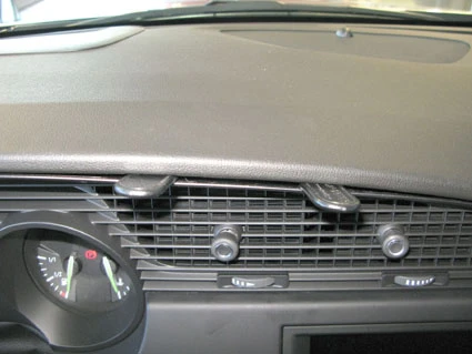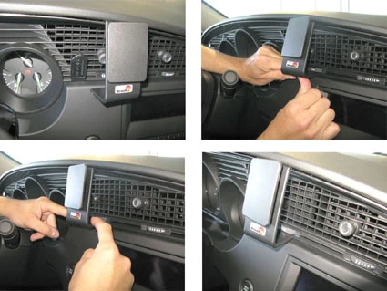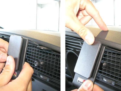 Press a gap opener into the gap between the air vent and the center console. Hook the angled egde on the lower part of the ProClip into the gap next to the gap opener. Pull out the gap opener. Place your index fingers inside the ProClip and press downward on the lower part so the angled edge goes all the way into the gap and the adhesive tape attaches.