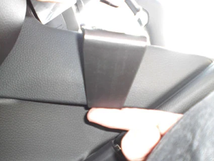 Place your fingers underneath the right side of the ProClip. Pull upwards and hook the angled edge on the right side of the ProClip over the console edge, and into the gap between the console edge and the center console panel.