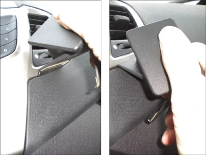 Use the enclosed alcohol pad to clean the area where the ProClip is to be installed. Peel off the cover of adhesive tape on the ProClip. Press the thin curved edge into the seam/gap between the panel frame surrounding the air vent and the padded part of the dashboard. Press forward and then flip the ProClip down so the curved edge on the upper part of the ProClip hooks behind the panel surrounding the air vent.