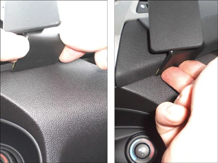 Press the thin end of the enclosed gap opener into the seam/gap between the dashboard and the dashboard overhang next to the ProClip, to widen the gap. Place your index finger on the lower inside of the ProClip. Pull down and hook the angled edge into the seam/gap next to the gap opener.