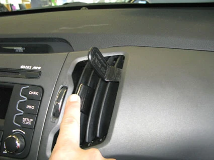Adjust the air vent maximum rightwards. Press the gap opener into the gap betwen the air vent and the surrounding panel. Press the left part of the ProClip rightward so the ProClip flexes slightly. Press the left part of the ProClip foward and release the pressure so the angled left edge is pressed into the gap above the gap opener. Pull out the gap opener. Adjust the air vent into desired direction.