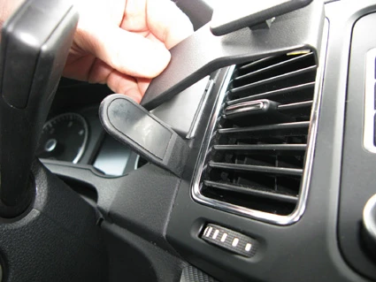 Use the enclosed alcohol pad to clean the area where the ProClip is to be installed. Press the thin end of the enclosed gap opener into the gap between the frame surrounding the air vent and the dashboard, to widen the gap. Peel off the adhesive tape cover on the ProClip.