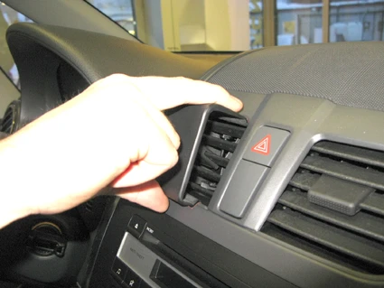 Press downward on the upper part of the ProClip so the ProClip flexes slightly. Then press the upper part forward into the air vent, so the angled edge is placed under the frame surrounding the air vent.