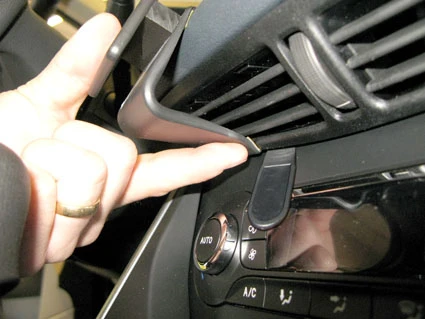 Press the gap opener into the gap between the frame surrounding the air vent and the center console. Pull the ProClip downward. Hook the angled edge on the lower part of the ProClip into the gap next to the gap opener. Press upward on the lower part of the ProClip so the angled edge goes all the way into the gap. Pull out the gap opener.
