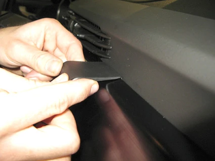 Use the enclosed alcohol pad to clean the area where the ProClip is to be installed. Peel off the adhesive tape cover on the ProClip. Press the angled edge on the lower part of the ProClip into the gap between the center panel and the dashboard.