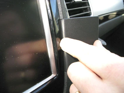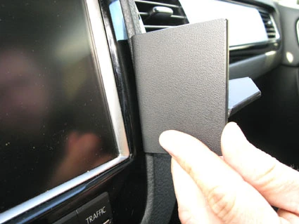 Use the enclosed alcohol pad to clea the area where the ProClip is to be installed. Press the thin end of the enclosed gap opener into the gap between the trim surrounding the air vent and the dashboard, to widen the gap. Peel off the adhesive tape cover on the ProClip. Press the curved edge on the left part of the ProClip into the gap bteween the center console and the dashboard.