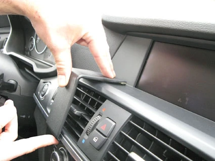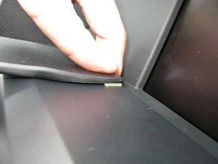 Use the enclosed alcohol pad to clean the area where the ProClip is to be installed. Peel off the adhesive tape cover on the ProClip. Press the angled edge on the lower part of the ProClip into the gap between the frame surrounding the air vent and the control panel.