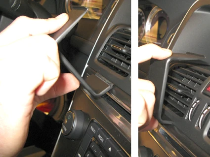 Press the upper part of the ProClip downward and then forward into the upper part of the air vent. Keep the lower part of the ProClip in place in the same position, in the same time pull the upper part toward you so the gap under the frame surrounding the air vent is widened and the angled upper edge of the ProClip hooks into the gap under the frame surrounding the air vent.