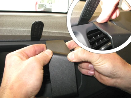 Press the thin end of the enclosed gap opener into the gap between the frame surorunding the air vent and the dashboard, to widen the gap. Place it in the lower right corner. Press the curved edge on the lower part of the ProClip into the gap next to the gap opener.