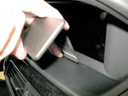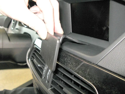 Use the enclosed alcohol pad to clean the area where the ProClip is to be installed. Peel off the adhesive tape covers on the ProClip. Press downward on the panel by the information window so it flexes slightly and the gap is widened. You will now see where the gap has a wider section. Press the curved edge on the upper part of the ProClip into the gap, into the wider section.
