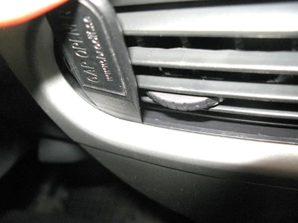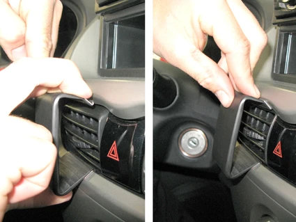Use the enclosed alcohol pad to clean the area where the ProClip is to be installed. Press the thin end of the enclosed gap opener into the gap between the frame surrounding the air vent and the center console, to widen the gap. Peel off the adhesive tape covers on the ProClip.