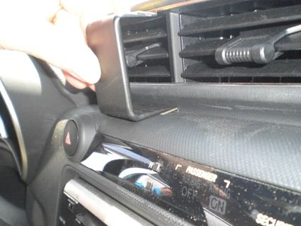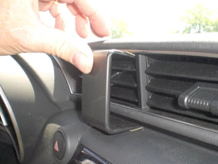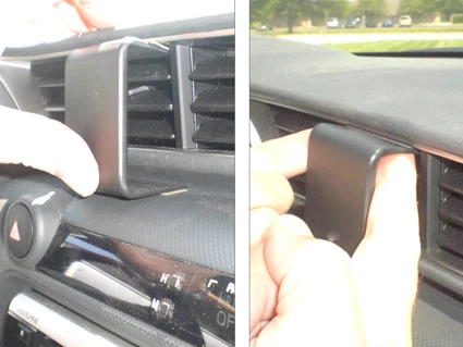Press forward on the lower part of the ProClip so the angled edge clicks into the seam/gap between the dashboard ledge and the air vent panel frame. Place your index fingers underneath the top part of the ProClip and press firmly upward so the angled edge goes into the seam in the air vent "roof".