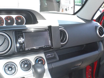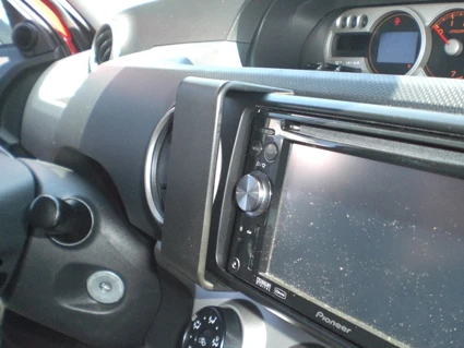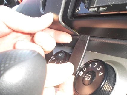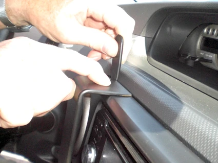 Press the gap opener into the gap between the dashboard ledge and the panel frame surrounding the stereo. Press firmly forward on the gap opener to widen the gap properly. At the same time, press firmly forward on the upper part of the ProClip so the angled edge hooks into the gap next to the gap opener. Press down on top of the ProClip for best possible attachment of the adhesive tape. Pull out the gap opener.