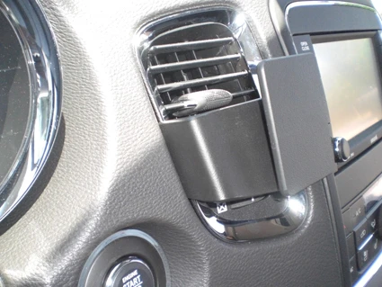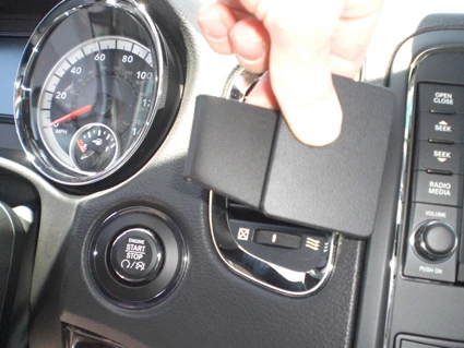 Press the thin end of the enclosed gap opener into the gap between the air vent frame and the padded part of the dashboard, to widen the gap. Press firmly forward on the left side of the ProClip so the grooved edge goes into the gap below the gap opener. Press until you see or hear/feel it click into place. Pull out the gap opener.