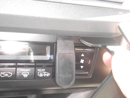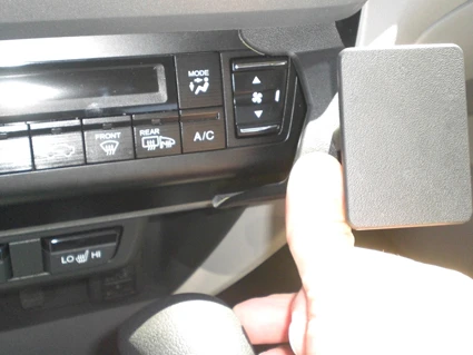 Use the enclosed alcohol pad to clean the area where the ProClip is to be installed. Press the thin end of the enclosed gap opener into the gap between the dashboard panel overhang and the climate control panel, to widen the gap just to the left of the fan control knob or button. Peel off the cover of adhesive tape on the ProClip. Hold the ProClip in a 90 degree angle. Press the angled edge on the upper part of the ProClip into the gap next to the gap opener.