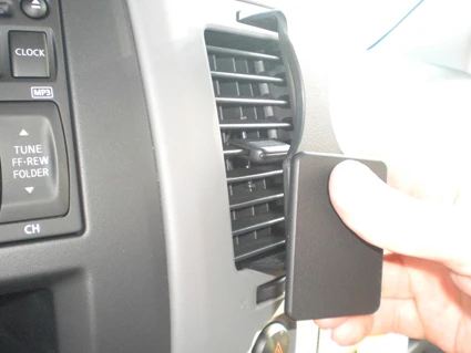 Use the enclosed alcohol pad to clean the area where the ProClip is to be installed. Peel off the adhesive tape cover on the ProClip. Place the angled edge on the lower part of the ProClip into the bottom part of the air vent. Press it down into the seam/gap between the air vent and the surrounding panel frame. Note: if the angled edge is hard to get into the gap, pull the panel frame firmly towards to widen the gap slightly and then press the angled edge into the gap.