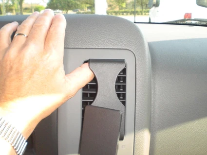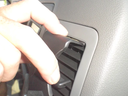 Press firmly down on top of the ProClip so it flexes downward. Hook the angled edge into the seam/gap between the air vent and the surrounding panel frame.